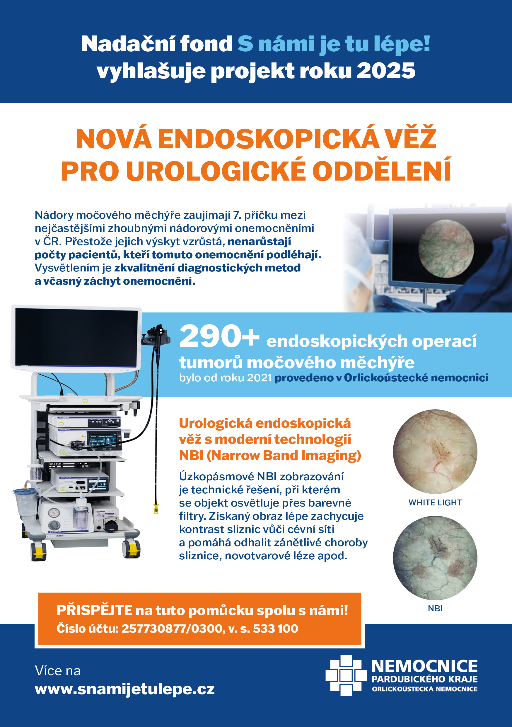 Nádory močového měchýře zaujímají 7. příčku mezi nejčastějšími zhoubnými nádorovými onemocněními v ČR. „Přestože jejich výskyt vzrůstá, nenarůstají počty pacientů, kteří tomuto onemocnění podléhají. Vysvětlení spočívá ve zkvalitnění diagnostických metod a včasném záchytu onemocnění,“ vysvětlil primář urologického oddělení Orlickoústecké nemocnice Martin Novák. Nadační fond S námi je tu lépe! vybral právě novou urologickou endoskopickou věž za svůj projekt roku 2025 a snaží se od měst, firem i jednotlivců získat prostředky na její pořízení. Věž by měla disponovat úzkopásmovým zobrazením NBI (Narrow Band Imaging), při kterém se objekt osvětluje přes barevné filtry. „Získaný obraz lépe zachycuje kontrast sliznic vůči cévní síti a pomáhá odhalit zánětlivé choroby sliznice, novotvarové léze a podobně,“ doplnil primář Novák.