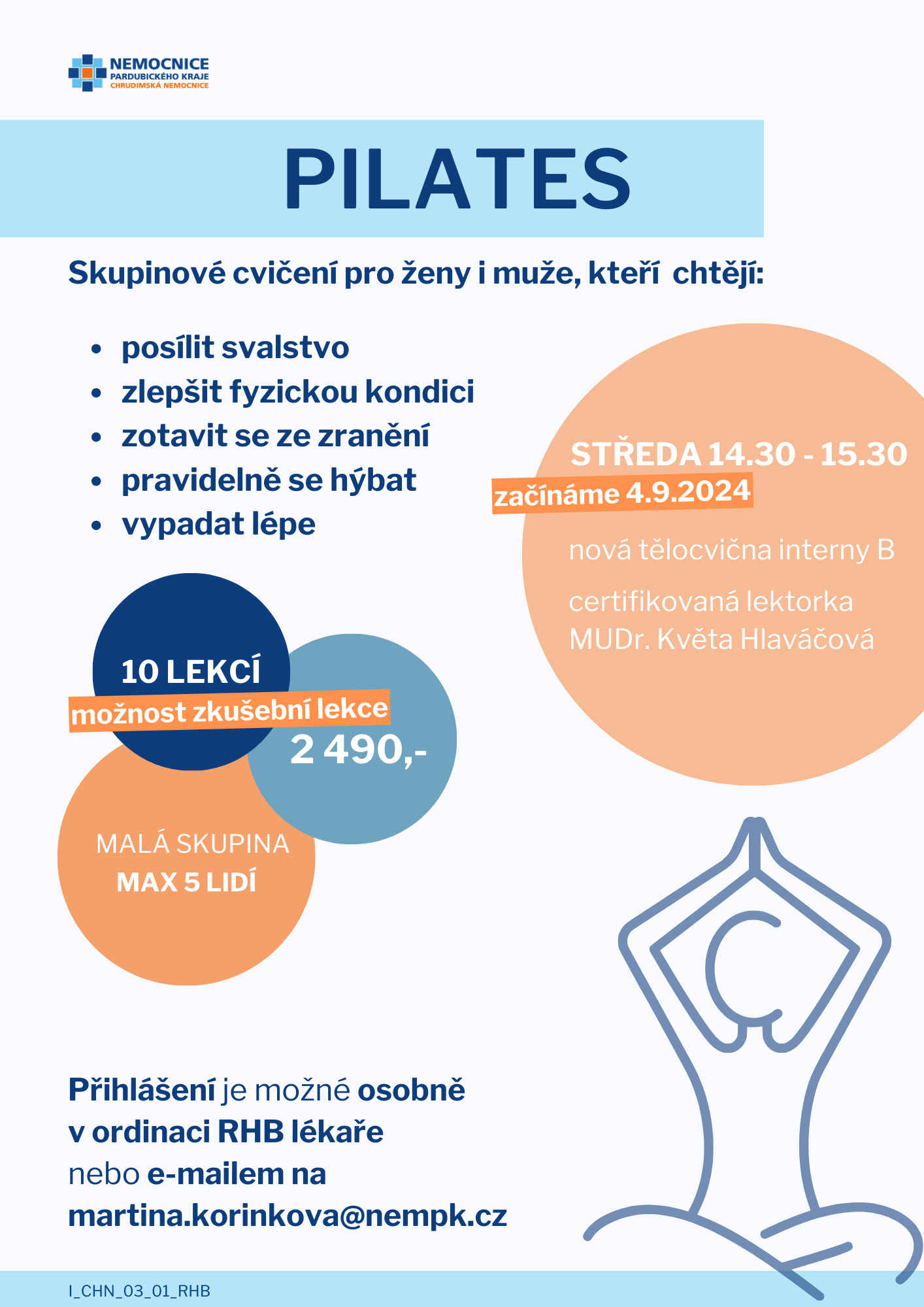 Lekce pilates začínají 4.září v nové tělocvičně interny B. Zájemci se mohou přihlásit osobně v ordinaci rehabilitačního lékaře, nebo e-mailem na martina.korinkova@nempk.cz.