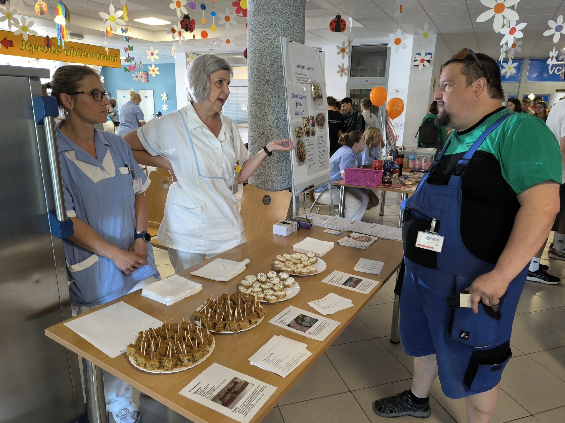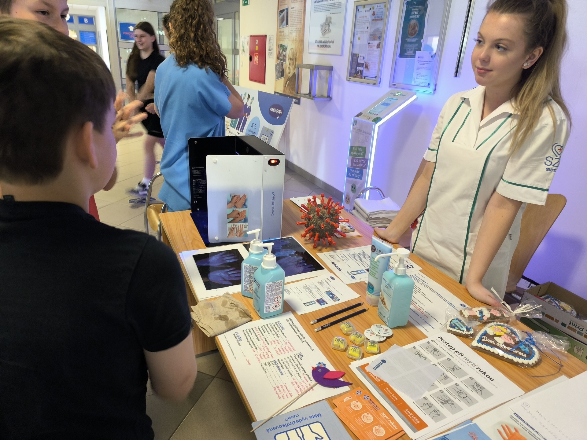 Na dalších stanovištích si návštěvníci vyzkoušeli nácvik hygieny rukou s kontrolou pod UV lampou, test čichu, test závislosti na návykových látkách, ochutnali zdravou a nutričně vyváženou svačinku nebo otestovali svoji fyzickou zdatnost na stanovišti rehabilitačního oddělení, kde fyzioterapeuti pracovali s balančními pomůckami. V neposlední řadě sestry z urologického oddělení poskytovaly informace o zdravém pitném režimu – jaké tekutiny zařadit, kolik cukru obsahují slazené nápoje nebo jak lze řešit inkontinenci.