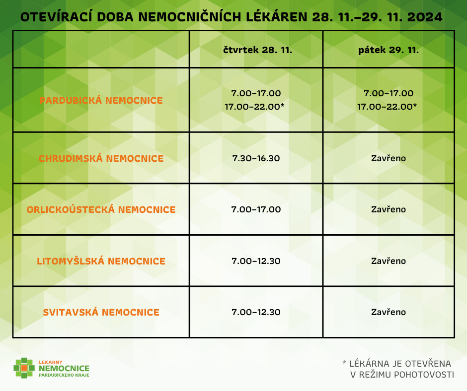 Z důvodu pravidelné inventury dojde ve čtvrtek 28. a pátek 29. listopadu 2024 k omezením provozu čtyř z pěti lékáren Nemocnice Pardubického kraje.