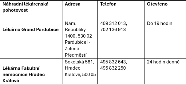 Pohotovostní služba z důvodu intentury bude zrušena ve středu 30. října. Pohotovostní službu zajistí po dobu omezení Lékárna Grand, s.r.o. v ulici náměstí Republiky 1400 (otevřena od 8.00 do 19.00 hodin, tel. 469 312 013), rovněž pak lékárna Fakultní nemocnice Hradec Králové (Sokolská 581, HK; tel. 495 832 643), která je otevřena nepřetržitě.