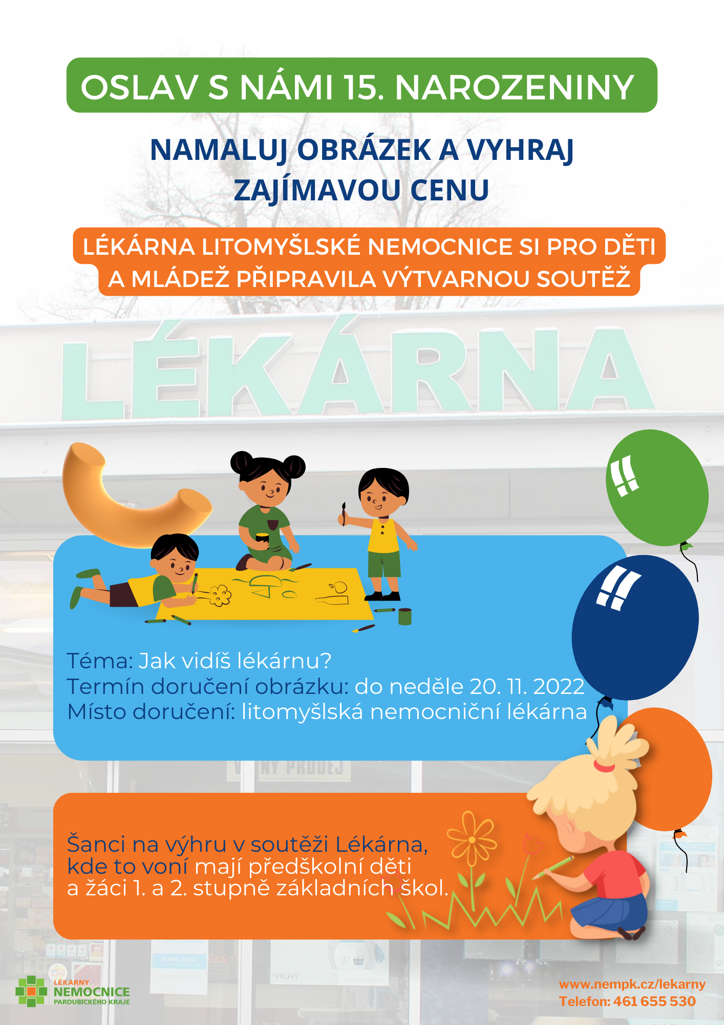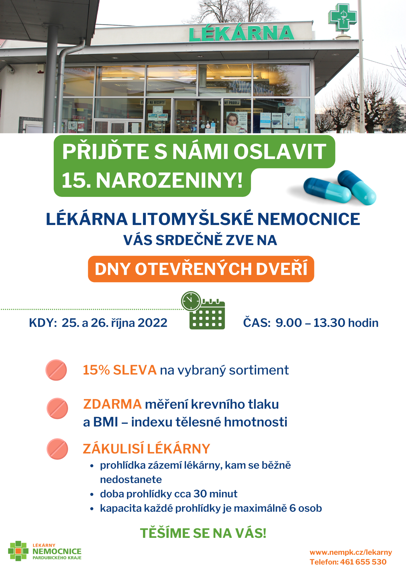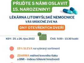 K 15. narozeninám uspořádá litomyšlská nemocniční lékárna Dny otevřených dveří, které se uskuteční v úterý 25. a ve středu 26. října 2022 od 9 do 13.30 hodin. Během nich budou moci zájemci nahlédnout do jejího zákulisí. Předpokládaná délka trvání prohlídky je cca 30 minut. Kapacita každé prohlídky je omezená maximálním počtem 6 osob.