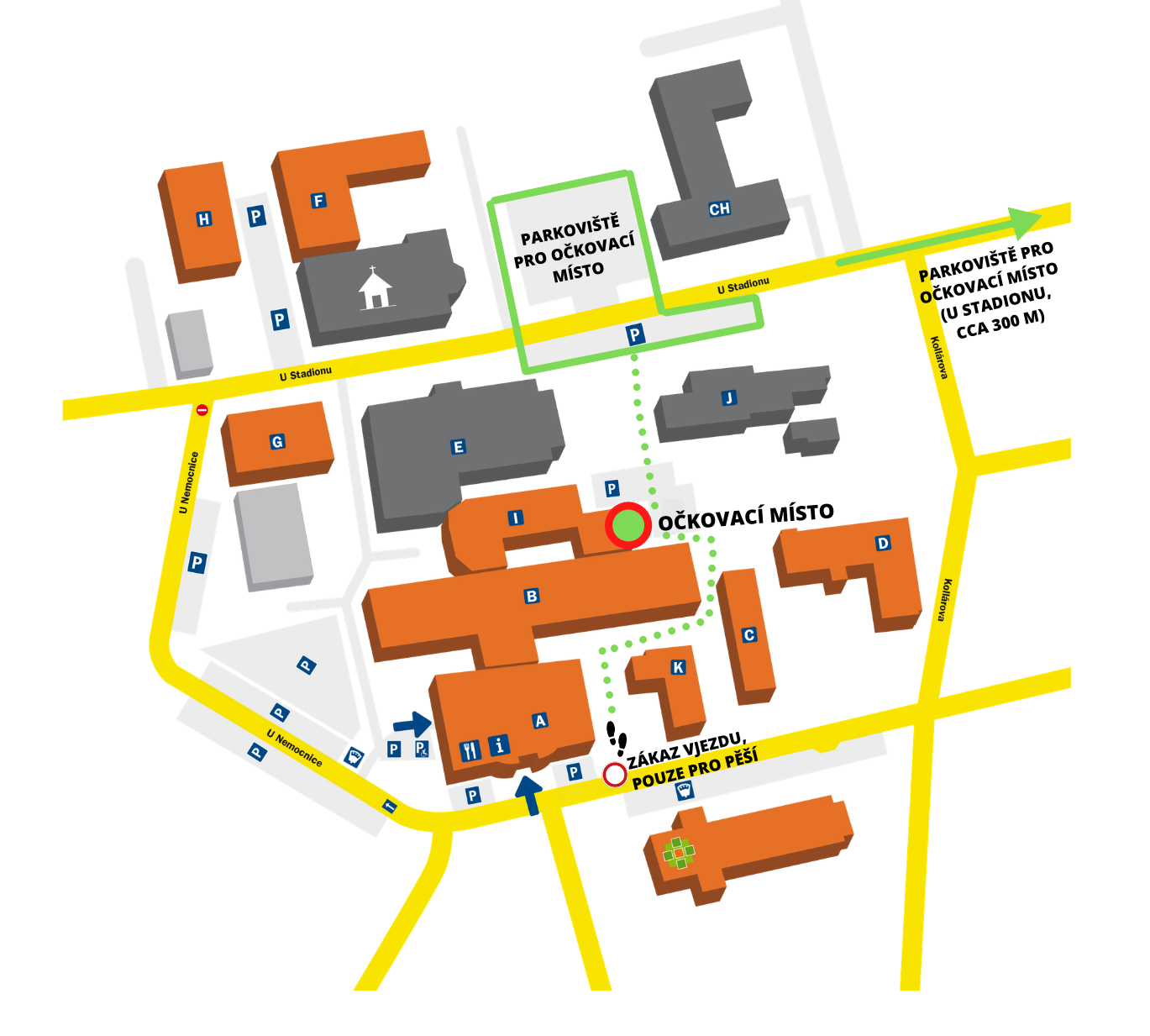 Pro pacienty je poblíž nové adresy očkovacího místa připraveno několik možností parkování, všechny jsou dostupné v krátké vzdálenosti z ulice U Stadionu (viz přiložená mapka).