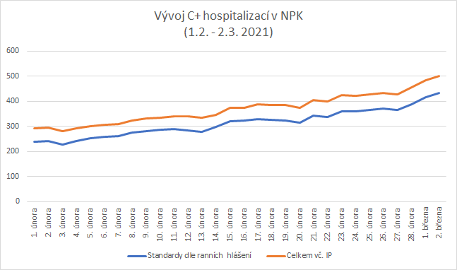Dramatickou situaci v našich nemocnicích dokumentuje i graf vývoje covid pozitivních hospitalizací v NPK v době od 1. února do současnosti. Aktuálně je v NPK hospitalizováno 501 pacientů s covidem-19, 69 z nich vyžaduje intenzivní péči.
