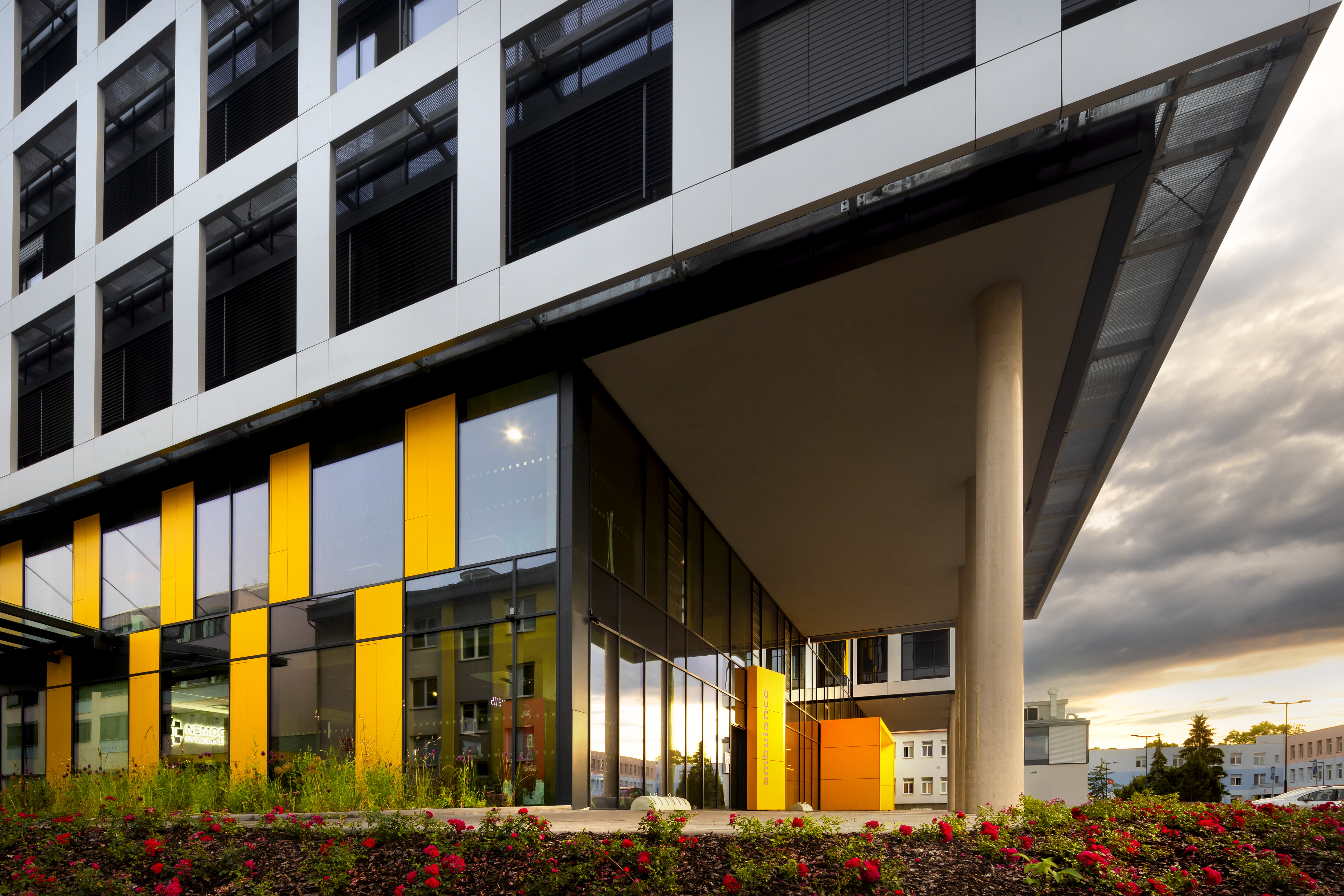 Chirurgické obory jako chirurgie, ortopedie, traumatologie, cévní a neurochirurgie, intenzivní péče, urgentní příjem nebo kontrolní ambulance. Přidejme ještě jedenáct nových operačních sálů, včetně sálu robotického, centrální sterilizaci a na střeše heliport. To vše se nachází v novostavbě uprostřed areálu Pardubické nemocnice.