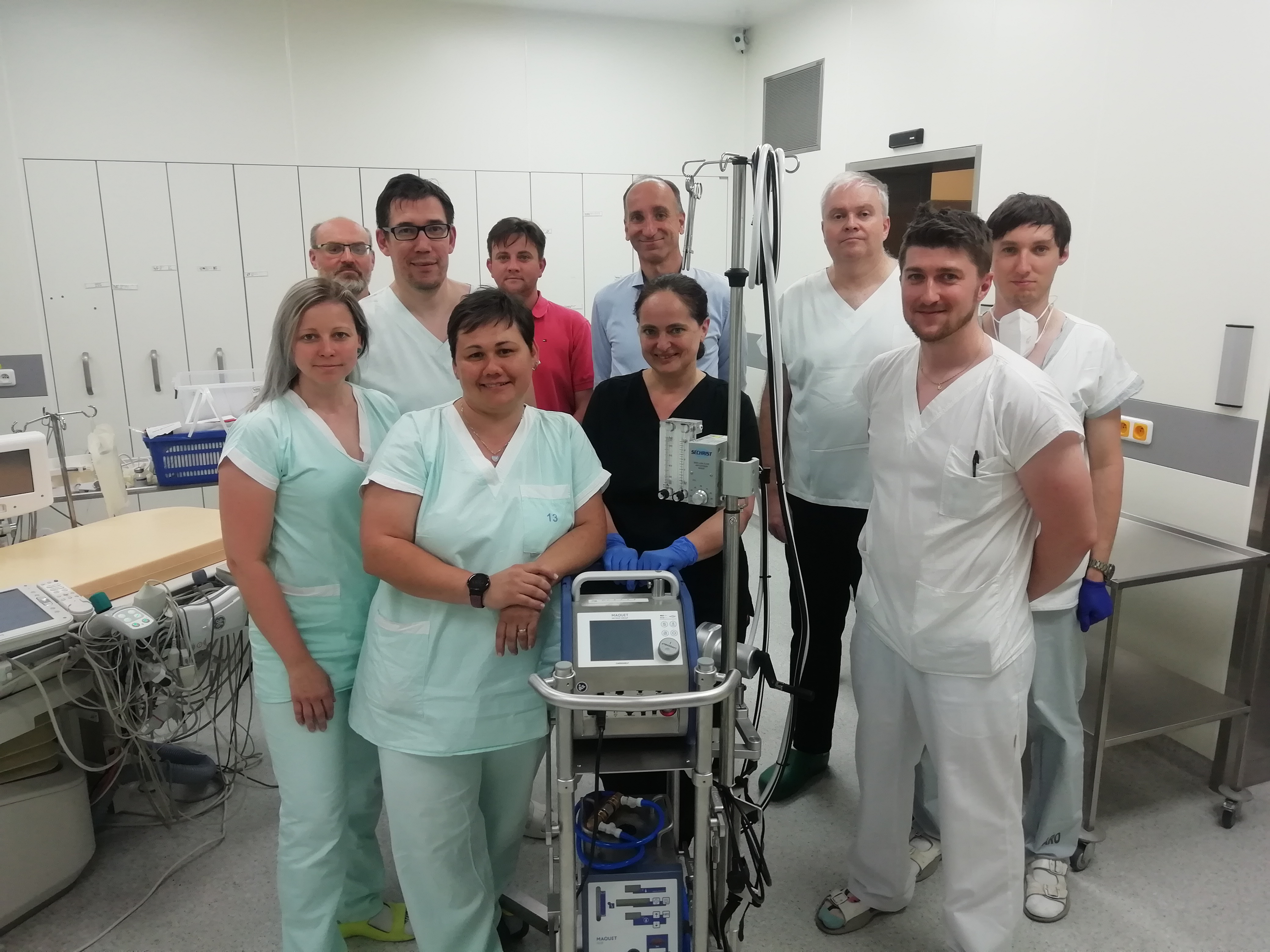 ECMO tým, který v Pardubicích provedl první operaci s využitím této technologie, zleva: Mgr. Kristýna Pospíchalová (sestra koronární jednotky kardiologického oddělení Pardubické nemocnice), MUDr. Jiří Pařízek (primář oddělení ARO Pardubické nemocnice), MUDr. Vojtěch Novotný, Ph.D. (invazívní kardiolog Kardiologického centra AGEL, lékař kardiologického oddělení Pardubické nemocnice), Eva Slováková, DiS. (sestra koronární jednotky kardiologického oddělení Pardubické nemocnice), Mgr. Pavel Hedvičák (perfuzionista FN Motol), prof. MUDr. Petr Ošťádal, Ph.D. (Nemocnice na Homolce, Praha, předseda České kardiologické společnosti), MUDr. Alena Staňková (vedoucí lékařka koronární jednotky kardiologického oddělení Pardubické nemocnice), MUDr. Jan Matějka, Ph.D. (primář kardiologického oddělení Pardubické nemocnice), MUDr. Petr Coufal (lékař koronární jednotky kardiologického oddělení Pardubické nemocnice), MUDr. Jaroslav Záveský (lékař ARO Pardubické nemocnice). Na fotografii chybí sestra Kardiologického centra AGEL Šárka Holá.