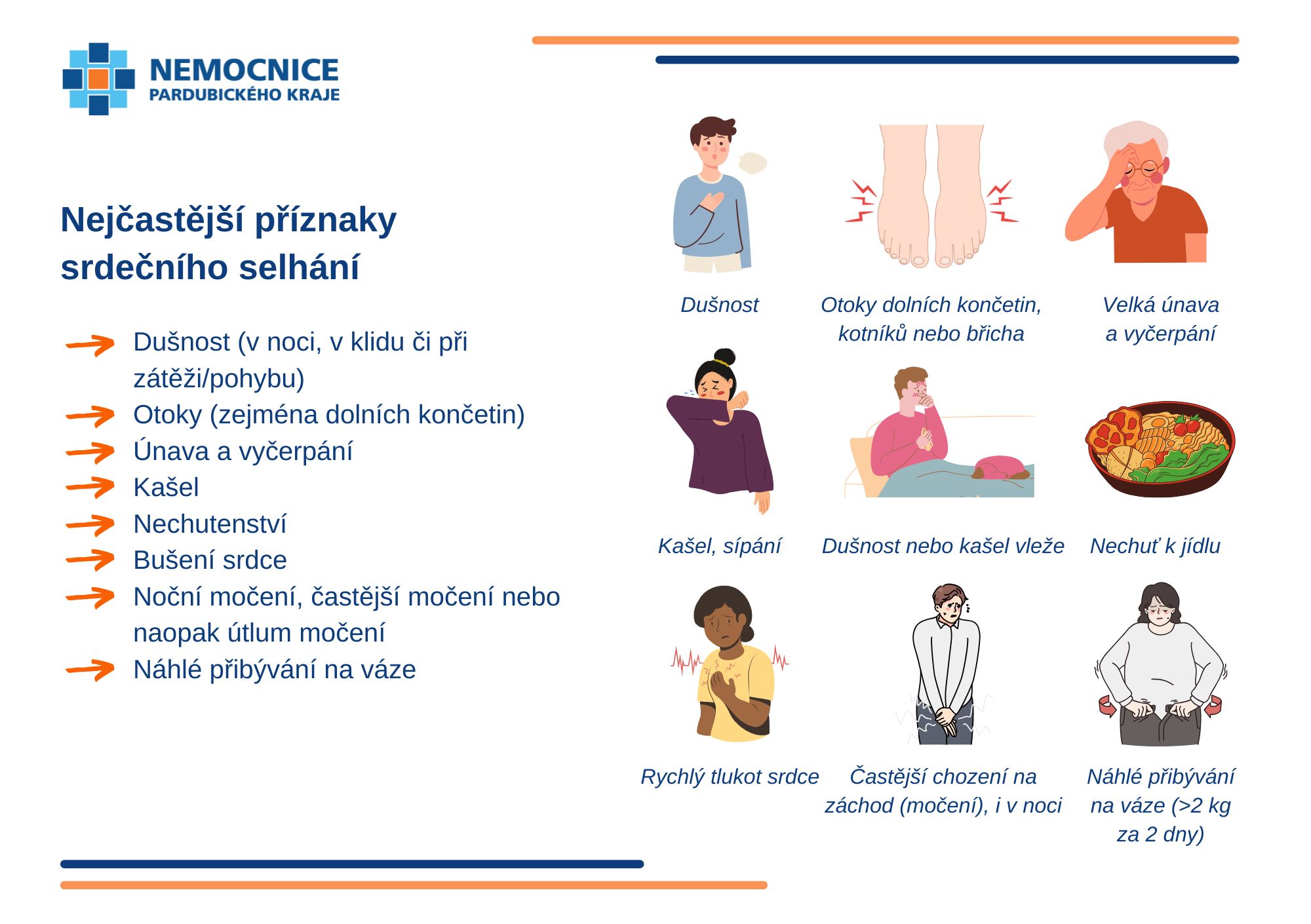 Kardiovaskulární onemocnění jsou v dnešní době nejčastější příčinou úmrtí naší civilizace. Podle primáře kardiologického oddělení Pardubické nemocnice Jana Matějky se tato onemocnění dělí do několika skupin: „Nejčastěji v praxi vidíme projevy ischemické choroby srdeční jako akutní infarkt či angina pectoris. Další velká skupina je tromboembolická, kam spadá například plicní embolie. Výjimkou nejsou ani srdeční arytmie, a právě srdeční selhání. To je nebezpečné v tom, že se může projevovat zpočátku velmi nenápadně.“ Srdeční selhání je mnohdy chronický stav, který se akutně zhorší. „Typický scénář je takový, že je pacientovi tato choroba diagnostikována, léčí se s ní a přijde pro její zhoršení. Tím může být i akutní srdeční selhání, to znamená pocit silné dechové tísně v klidu, vyžadující zpravidla hospitalizaci na jednotce intenzivní péče, nebo zhoršení námahové dušnosti, vyžadující neodkladné lékařské vyšetření,“ říká kardiolog.