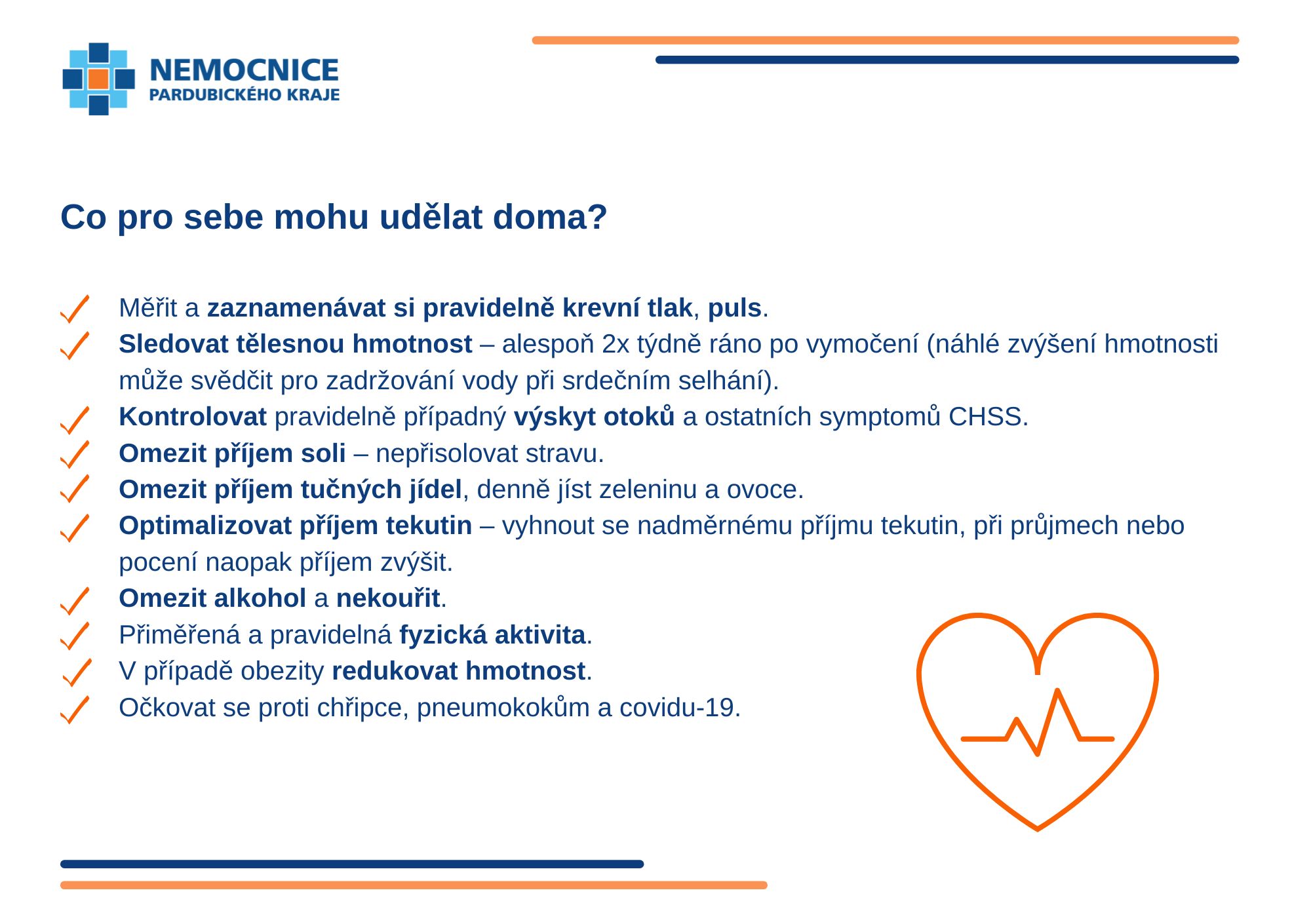 V loňském roce pak Centrum pro srdeční selhání připravilo pro své pacienty brožurku s informacemi. Ta má pomoci zorientovat se v problematice srdečního selhání, jeho příznacích, monitoraci v domácím prostředí, režimových opatřeních a informovat o situacích, kdy je vhodné kontaktovat lékaře či volat 155 (RZP).