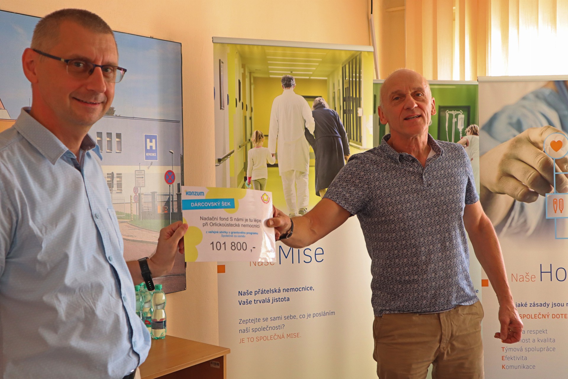 Šek na celkových 101 800 korun tak ředitel obchodního družstva KONZUM Ústí nad Orlicí Miloslav Hlavsa předal předsedovi Nadačního fondu S námi je tu lépe! Kvido Štěpánkovi, členovi správní rady fondu Josefu Hájkovi a náměstkovi léčebné péče Orlickoústecké nemocnice Vratislavu Dědkovi.