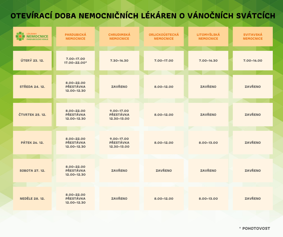 Aktuální provozní dobu lékáren najdete v tabulce níže. Prodejna zdravotnických potřeb v Pardubické nemocnici bude otevřena naposledy 23. 12., poté zůstane po dobu vánočních svátků uzavřena. Znovu otevře v pondělí 29. 12. 2025.