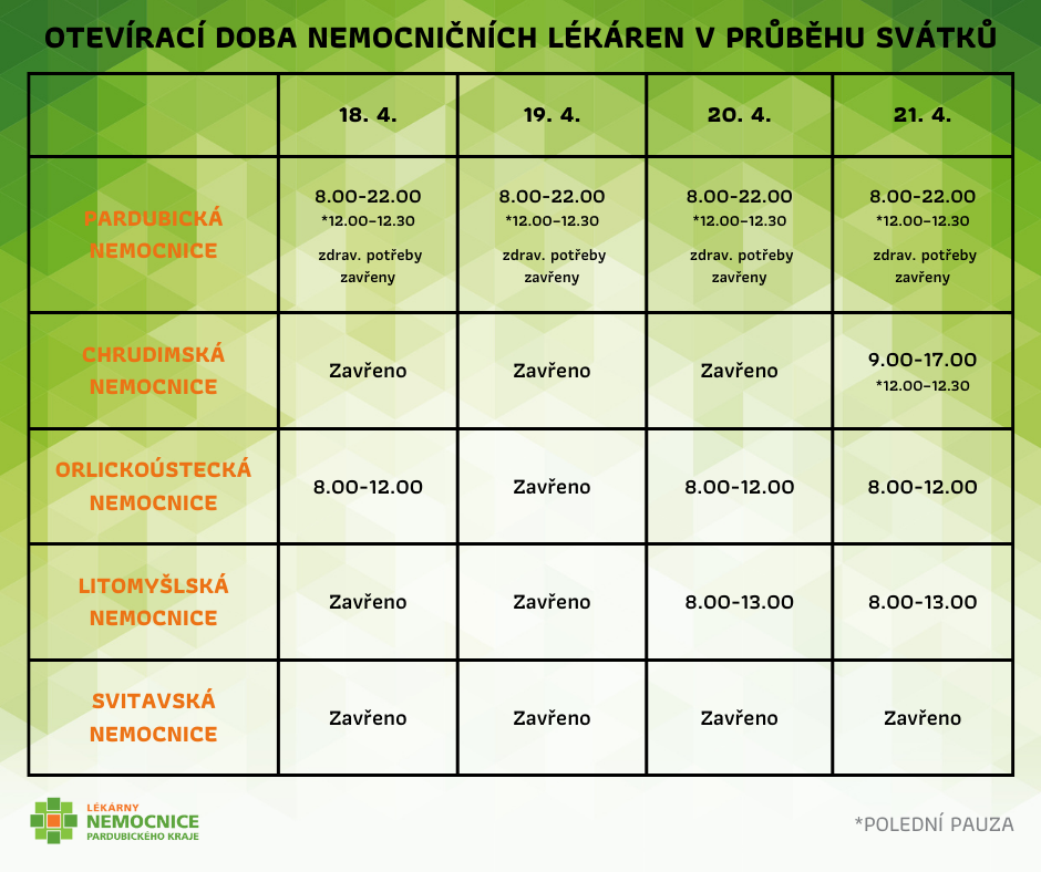 Během následujících velikonočních svátků budou mít nemocniční lékárny upravenou otevírací dobu.