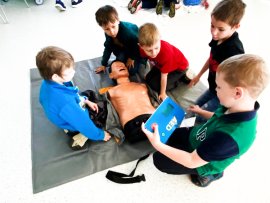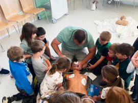 Závěr půldenní exkurze patřil prohlídce Dětského oddělení včetně zahrady. Tam se dětí ujaly učitelky ze ZŠ a MŠ při nemocnici, které si pro ně připravily další program s tématikou první pomoci. Školáci si třeba zopakovali důležitá čísla pro tísňové volání hravou formou spojování a vybarvování obrázků na pracovním listu, ale také si mohli v herně vyzkoušet interaktivní hračky.
