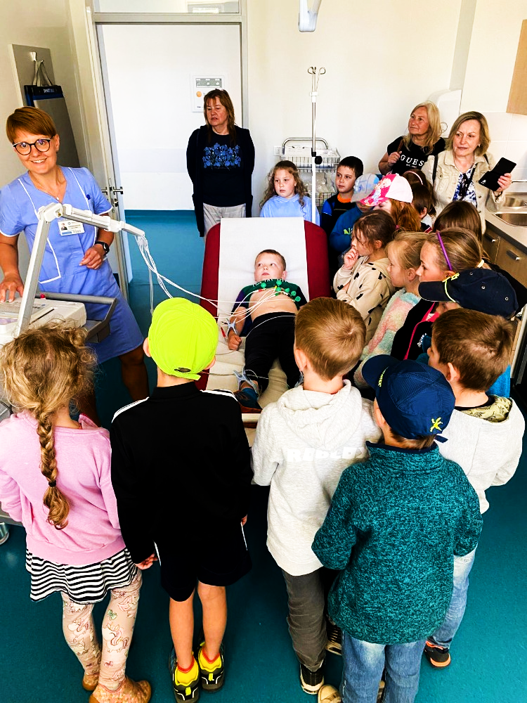 Lékaři připravili pro žáky i prohlídku interní ambulance na urgentním příjmu, kde děti mohly v roli pacienta zažít vyšetření přístrojem na EKG.