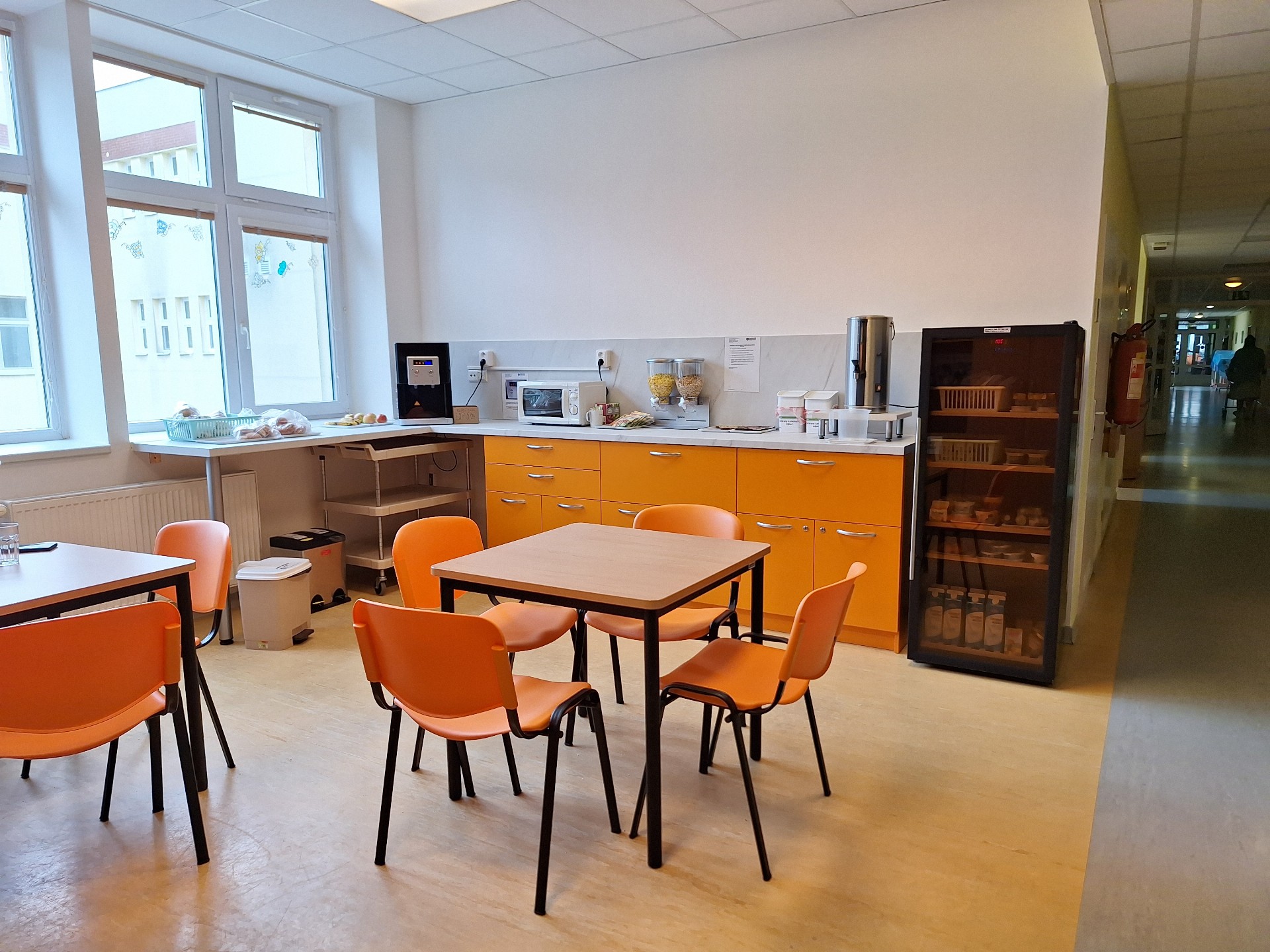 Jednotlivé produkty sestřičky objednávají denně přes interní objednávací systém. „Časem se ještě uvidí, o co je největší zájem. Zatím jsme vzali od každého něco,“ doplňuje vrchní sestra. „Každá si přijde jistě na své. Mají tady například šunku, sýry, tvarohy, mléko, jogurty, pomazánky, marmelády, slané i sladké pečivo, přesnídávky, med, müsli, ovesné kaše, ovoce a další. Co se týče nápojů, k dispozici je čaj, voda,“ pokračuje přednosta gynekologicko-porodnické kliniky Germund Hensel. Nabídka je uzpůsobená dietě č. 3, tedy bez omezení. Rodičky s diabetickou dietou si mohou samy vybrat, co jim bude vyhovovat. V případě potřeby jim je vždy k dispozici sestřička, která jim ráda pomůže s výběrem vhodné stravy.