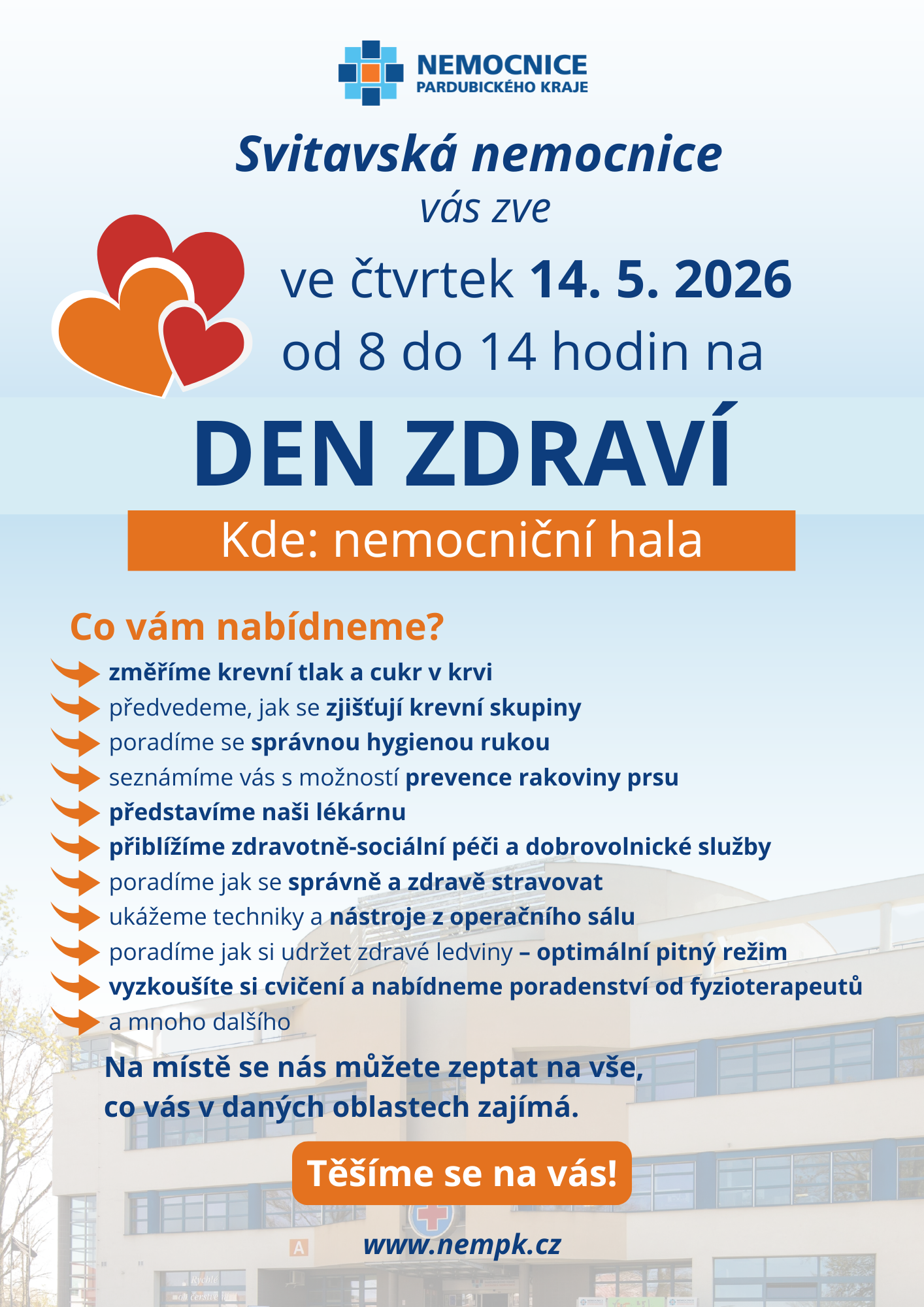 Ve Svitavské nemocnici se ve čtvrtek 14. května 2026 od 8.00 do 14.00 hodin uskuteční v prostorách nemocniční haly Den zdraví.